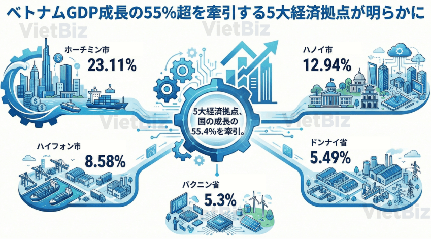 ベトナム統計局(財務省)によれば、2025年にハノイ、ホーチミン、ハイフォン、ドンナイ、バクニンの5省市がベトナムGDP成長の55.4%を占め、最大規模の経済拠点として成長を牽引した。