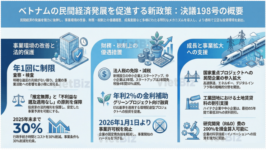 2025年5月17日、ベトナム国会は決議第198/2025/QH15号を採択した。これは、ベトナムの民間経済発展政策における強力な転換点となるものである。本決議は、ビジネス環境の改善および企業障壁の撤廃を目的とした一連の特別メカニズムを提示している。