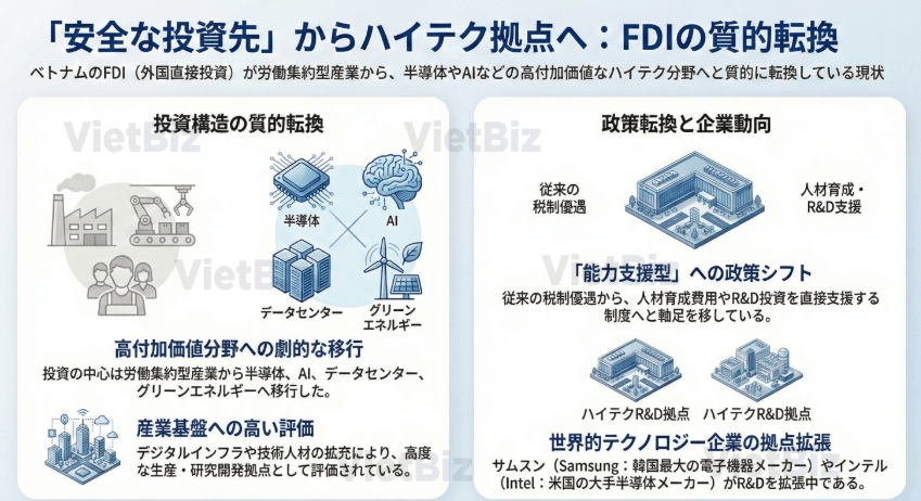長年にわたり、低コスト労働力と地理的優位性を背景にFDIを誘致してきたベトナムであるが、2025年以降、投資構造は大きく変化し、2026年にその傾向が一段と鮮明となった。投資の中心は、労働集約型産業から、半導体、AI、データセンター、グリーンエネルギーといった高付加価値分野へと移行している。