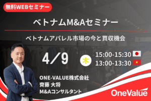 本セミナー「ベトナムアパレル市場の今と買収機会」では、まずベトナムアパレル市場の現状や主要プレイヤー、業界構造、直近の市場動向について整理し、どのような領域に事業機会があるのかを俯瞰的に解説します。その上で、M&Aを通じた市場参入・事業拡大の可能性や、買収機会を検討する際の着眼点について、実務的な観点からご紹介します。