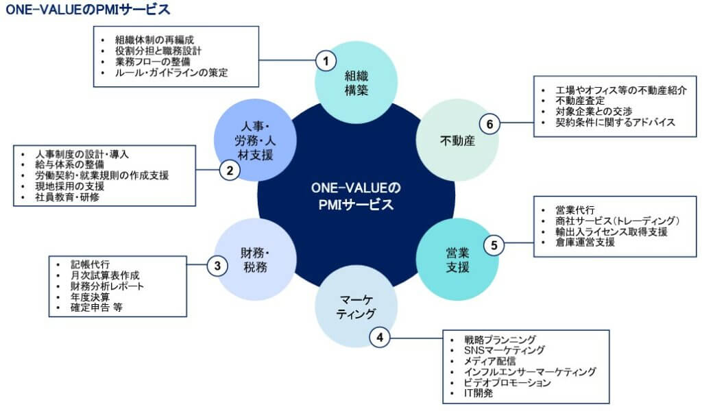 ONE-VALUEのPMI(統合支援)は、日本人とベトナム人の混合チームが現地企業に入り込み、組織体制の構築から営業支援までを一気通貫でサポートする「ハンズオン(現場介入)型」のPMIサービスです。