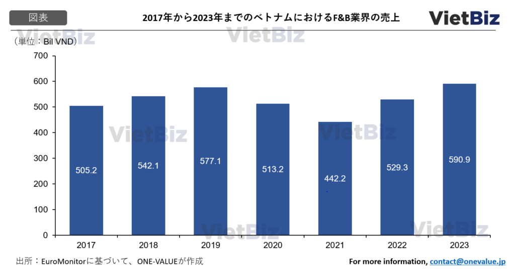 最近の経済不況にもかかわらず、ベトナム、特にハノイやホーチミンのような大都市では、外食の傾向が増加している。Euromonitor社によると、2023年にベトナムの食品・飲料産業は11.47%の目覚ましい成長を達成し(2022年比)、総売上高は 590,000 Bil VNDを超えた。外食市場だけでも 538,500 Bil VNDの売上高を記録し、2022年比で10.87%増加した。