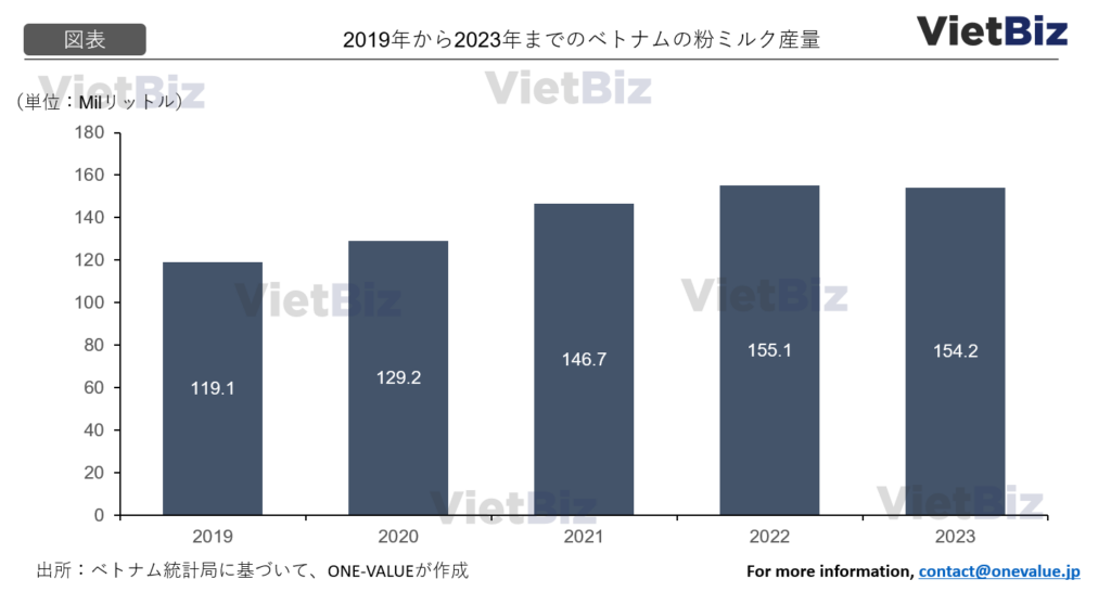 2023年、国内の液体ミルク生産量は1,410.2 Milリットルに達し、2022年比で7%増加した。粉ミルクの生産量は154.8千トンで、2022年比0.6%の削減である。
