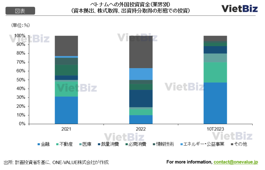 外国投資家がM&A市場の主要なアクターとなり、投資の戦略が短期的な投機的投資から有望な業界への長期戦略的投資に変わりつつある。短期的な減少があっても、ベトナムは安定した投資資金の流入を維持し、経済改革を進める。2023年のM&A活動は金融(47%)、不動産(23%)、医療(10%)に集中し、取引額全体の80%を占める。