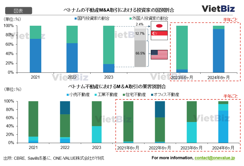 2024年上半期、不動産M&Aの取引額は、VingroupがVincom Retailの資産を売却した取引により増加し、その取引額は9億8230万ドルに達した。多くの分野と同様に、ベトナムの不動産M&A取引でも、外国投資家が依然として大多数を占めている。