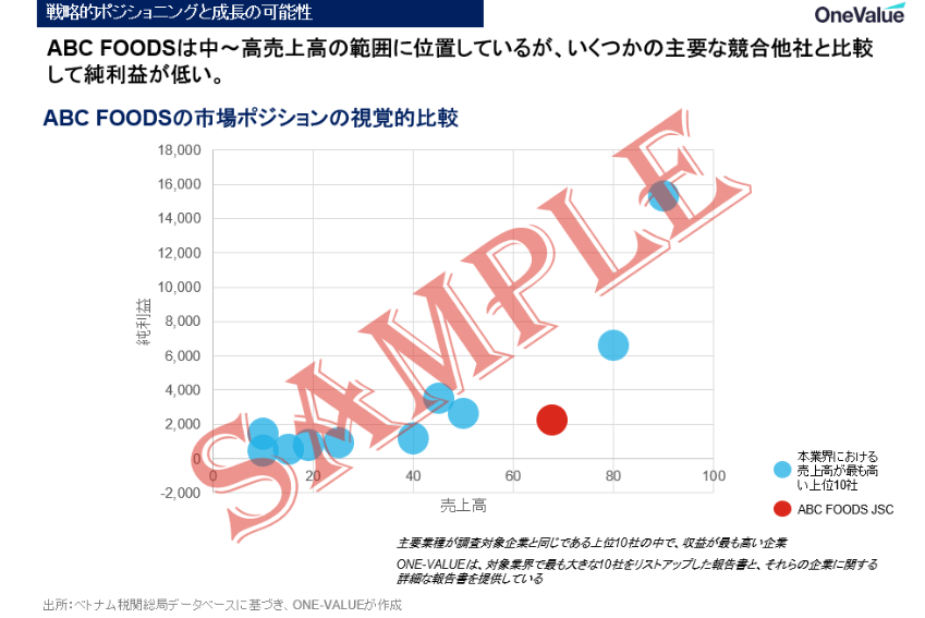 そこでONE-VALUEにご相談いただき、当社のデータベースを活用して、わずか1日でターゲット企業の概要、財務データ、株主構成、業界ポジション、さらにベトナム市場へ投資すべき論点整理までを含む報告書を作成しました。