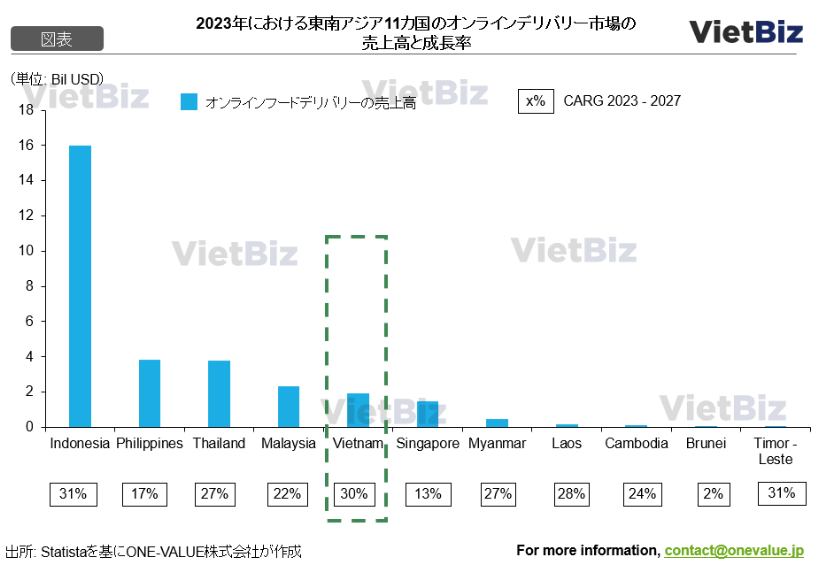 StatistaのASEANオンラインフードデリバリーレポートによると、2023年におけるベトナムのオンラインフードデリバリー市場の総売上は、インドネシア、フィリピン、タイ、マレーシアに次いで東南アジアで5位に位置するが、前年同期比の成長率は3位であり、2023年から2027年のCAGRは30%と予測され、急速に成長している。東南アジアで2番目に多い人口を持つベトナムは、今後のオンラインフードデリバリー市場の成長に大きな潜在力を示している。