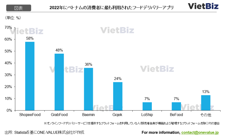 さらに、オンラインフードデリバリーブランドはベトナムで普及しつつある。Statistaの2022年に最も多く利用されたオンラインフードデリバリーアプリに関する報告によると、ShopeeFoodが最も多く使用され、次いでGrabFood、Baemin、Gojekが続く。