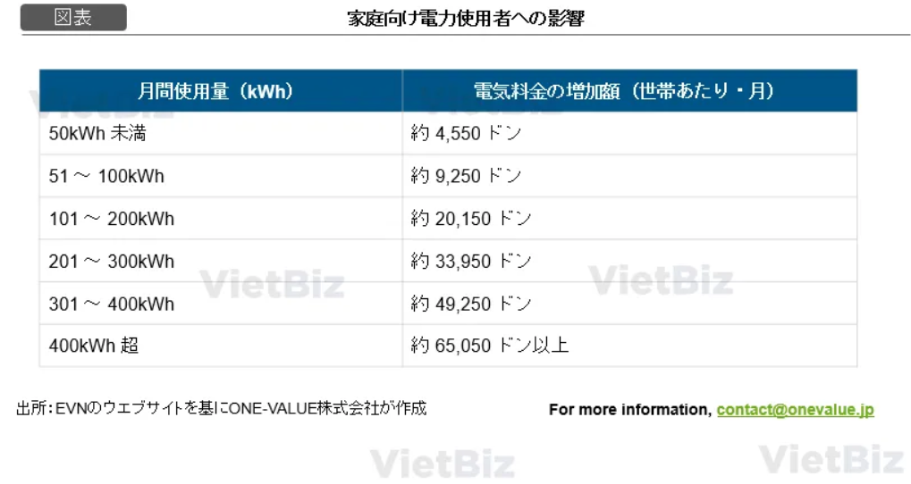 世帯の電力使用量に応じて月々の負担額は増加するが、その影響は限定的であり、月100kWh未満の使用では約1万ドン以下の負担増にとどまる。政府は貧困世帯や社会的扶助対象世帯に対し、最大30kWh分の補助を継続しており、低所得層の負担は最小限に抑えられている。