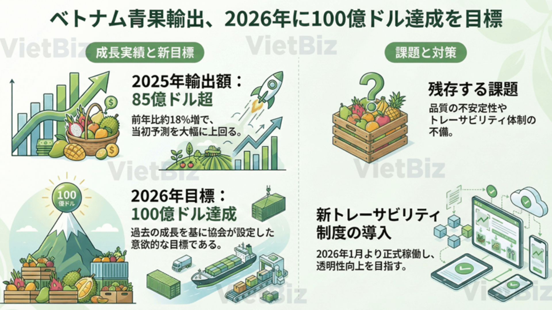 2025年、ベトナムの青果(野菜・果物)輸出額は推計85~86億ドル(約1兆2750億円~1兆2900億円)となり、2024年比で約13~14億ドル増、約18%の成長を記録し、当初の予測を大きく上回った。これは、農業・環境分野の2025年総括および2026年計画会議において、ベトナム青果協会のグエン・タイン・ビン会長が明らかにしたものである。この成長を背景に、同協会は2026年に輸出額100億ドル(約1兆5000億円)の達成が可能との認識を示している。