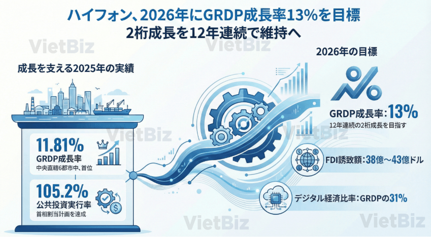 ハノイ近郊の港湾都市ハイフォンは、2026年の域内総生産(GRDP)成長率を13%とする目標を掲げ、2桁成長を12年連続で達成することを目指している。地方当局によると、同市は引き続き北部地域における主要な経済成長エンジンとしての地位を強化していく方針である。