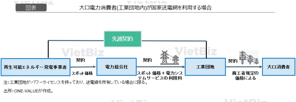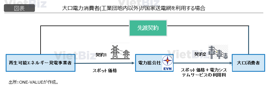 (2)国家送電網を通じて電力を売買する場合:電力は、商工省が発行した契約フォームに基づいて売買される(この契約フォームは、他の大口電力消費者向けのものとは異なる)。この契約の売り手は再生可能エネルギー発電所ではなく、EVN傘下の電力総公社である。電力購入価格はスポット市場の価格に電力システムサービスの利用料を加えたものである。電力システムサービスの利用料については、本法令では計算式のみが示されており、計算に使用される数値は発電所の技術仕様や電力使用量、及び契約上の電力量と実際の電力使用量の差異に依存する。