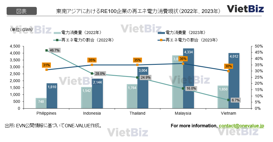 2022年、ベトナムで事業を行う93社のRE100企業の総消費電力量は1,650 GWhであるが、再生可能エネルギーから供給される電力量は僅か111 GWhで、割合は7%にすぎない。この比率はフィリピン(47%)、中国(32%)、インドネシア(28%)、タイ(25%)、マレーシア(16%)に比べてはるかに低い。2023年、ベトナムで事業を行うRE100企業が126社であり、総消費電力量は4,012GWh、2.4 倍になった。再生可能エネルギーから供給される電力量の割合は30%で、グリーン電力使用の顕著な増加になった。