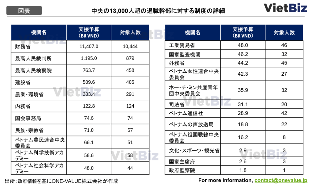 財務省以外にも、多くの中央機関が定員削減対象者に対する支給のための予算配分を受けている。具体的には、最高人民裁判所が879人(約1.2兆VND)、建設省が405人(5,090億VND超)、農業農村開発省が291人(3,030億VND超)である。国会事務局、ベトナム農民協会、民族・宗教省、大統領府、文化・スポーツ・観光省なども少人数ながら対象者がおり、すべて支給が保証されている。
