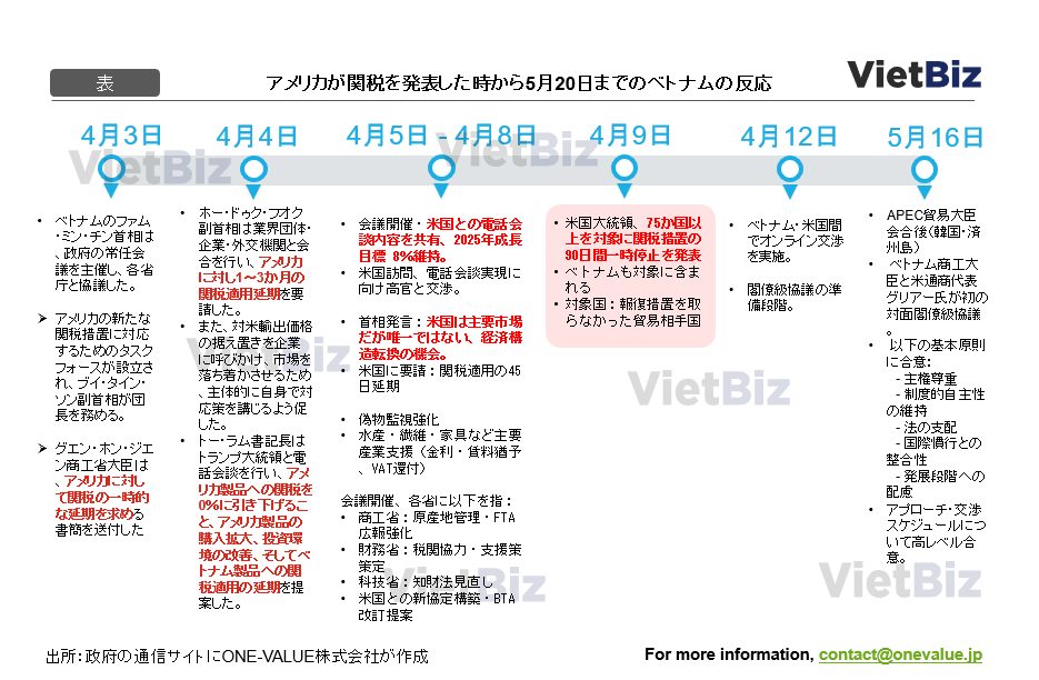 これにより、ベトナムを含む複数の貿易相手国に対する関税引き上げの適用は、一時的に停止された。