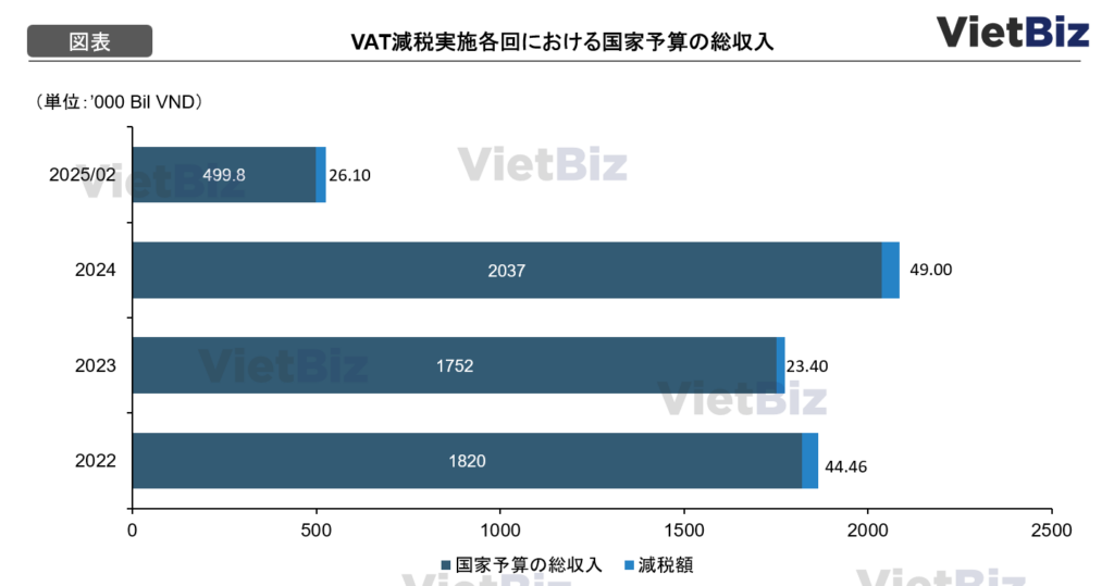 2022年以降、政府は継続的に国会に対して、VATの税率が10%である多くの品目やサービスに対し、2%の減税(10%から8%)を提案し続けている。減税を実施するたびに、歳入は減るどころか増加する。たとえば、2024年には、国家予算の総収入が初めて2,000,000 Bil USDを超え、2023年と比べて320,000 Bil VND以上増加する。特に現在のように、ベトナムが8%以上の成長目標を掲げている状況では、税の引き下げはより力強く、断固として進める必要がある。