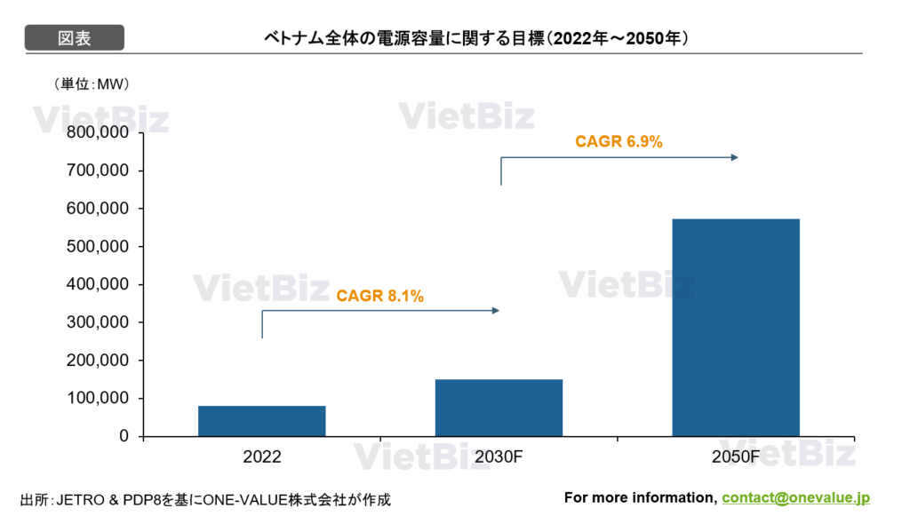 2030年までにVingroupが投資を予定している発電容量は計25,500MW、総投資額は250~300億USD。さらに2031~2035年には追加で27,000MWの開発が予定されている。PDP8では、2030年に15万MW、2050年には57.3万MWの発電容量を目指しており、石炭火力の割合を減らし、再生可能エネルギーの割合を大幅に引き上げることが掲げられている。