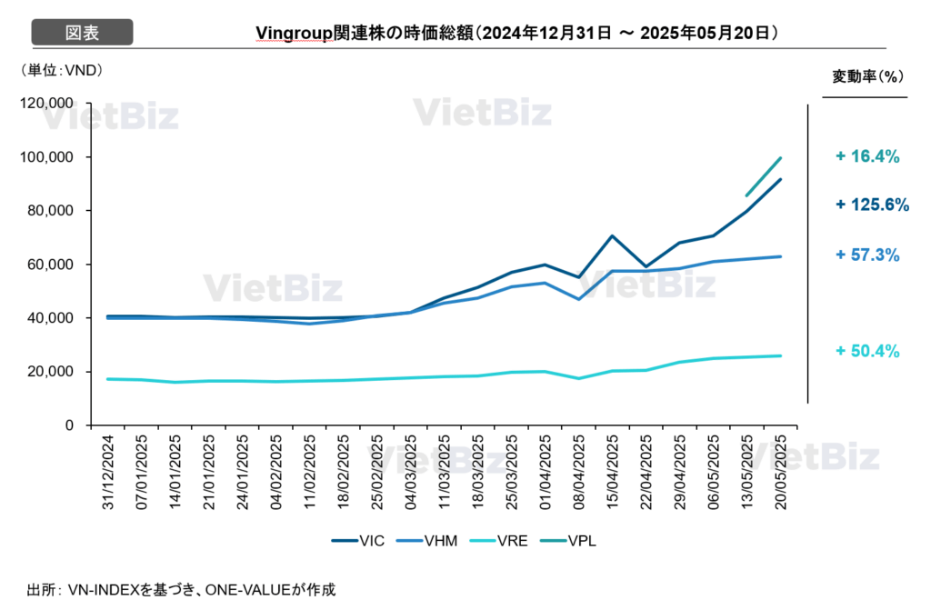 2025年初頭から5月20日までにVN-Indexは48.4ポイント(約3.8%)上昇し、そのうちVingroup株が93ポイントを押し上げた。VIC株は5か月で126%上昇し、過去3年超で最高値を更新。VHMは57%上昇し2023年8月以来の高値、VREも50%以上上昇し前年3月以来の高値を記録した。「新顔」VPLも上場から間もなく約16%の上昇を見せている。